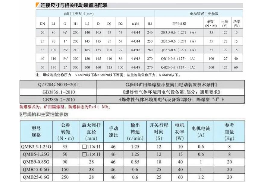 上海湖泉閥門集團有限公司礦用小口徑電動球閥是一種由球體旋轉(zhuǎn)而開閉水路的新型礦用隔爆型電動球閥(以下簡稱電動球閥),由于其適應(yīng)的供水壓力范圍廣、不受泥沙、污水影響、供水通徑大、工作過程中通電時間短、工作穩(wěn)定可靠、是一種代用電磁閥的理想替代產(chǎn)品。 防爆型式:隔爆型;防爆標(biāo)志:ExdⅠ,是一種由球體旋轉(zhuǎn)而開閉水路的新型礦用隔爆型電動球閥(以下簡稱電動球閥),由于其適應(yīng)的供水壓力范圍廣、不受泥沙、污水影響、供水通徑大、工作過程中通電時間短、工作穩(wěn)定可靠、是一種代用電磁閥的理想替代產(chǎn)品。 防爆型式:隔爆型;防爆標(biāo)志:ExdⅠ。 執(zhí)行標(biāo)準(zhǔn):Q/ZLH07-2008、MT/715-1997標(biāo)準(zhǔn)。 正常工作條件: 電動閥應(yīng)在下列條件下可靠的工作: 海拔高度不超過2000m; 環(huán)境大氣壓80-110kPa; 環(huán)境溫度-20-+40℃; 周圍空氣相對濕度不大于95%(25℃時); 具有甲烷混合物及煤塵爆炸危險的煤礦井下; 在無顯著振動的地方; 在無破壞金屬絕緣的氣體和蒸氣的環(huán)境; 在無滴水的地方。是一種由球體旋轉(zhuǎn)而開閉水路的新型電動閥門,它由數(shù)字邏輯控制電路,方向控制電路,電流采樣控制電路,工作狀態(tài)指示電路等組成;接入24VDC電源后,控制端K1、K2有繼電器無源點控制球閥的開啟與關(guān)閉,K1與K2短接球閥打開,K1與K2斷開球閥關(guān)閉。由電流采樣控制電路檢測球閥的工作位置, 工作狀態(tài)指示電路指示球閥的工作狀態(tài): 球閥旋轉(zhuǎn)開啟,綠色LED亮;當(dāng)開啟到設(shè)定口徑時,黃燈亮(此時電機不耗電);當(dāng)球閥旋轉(zhuǎn)關(guān)閉時,紅燈亮(此時電機不耗電)。 四.主要技術(shù)參數(shù) 1. 防爆標(biāo)志: ExdⅠ 2. 輸入電壓: 24V DC. 3. 工作電流: ≤70mA DC. 4. 環(huán)境溫度: 0℃~40℃ 5. 環(huán)境濕度: ≤95%RH.(25℃時) 6. 大氣壓力: 80~110kPa 7. 水壓適應(yīng)范圍 : 0.2MPa~7.0MPa。 8. 水溫適應(yīng)范圍 : 0~60℃ 9. 球閥開啟速度 : 6s~12s 10。